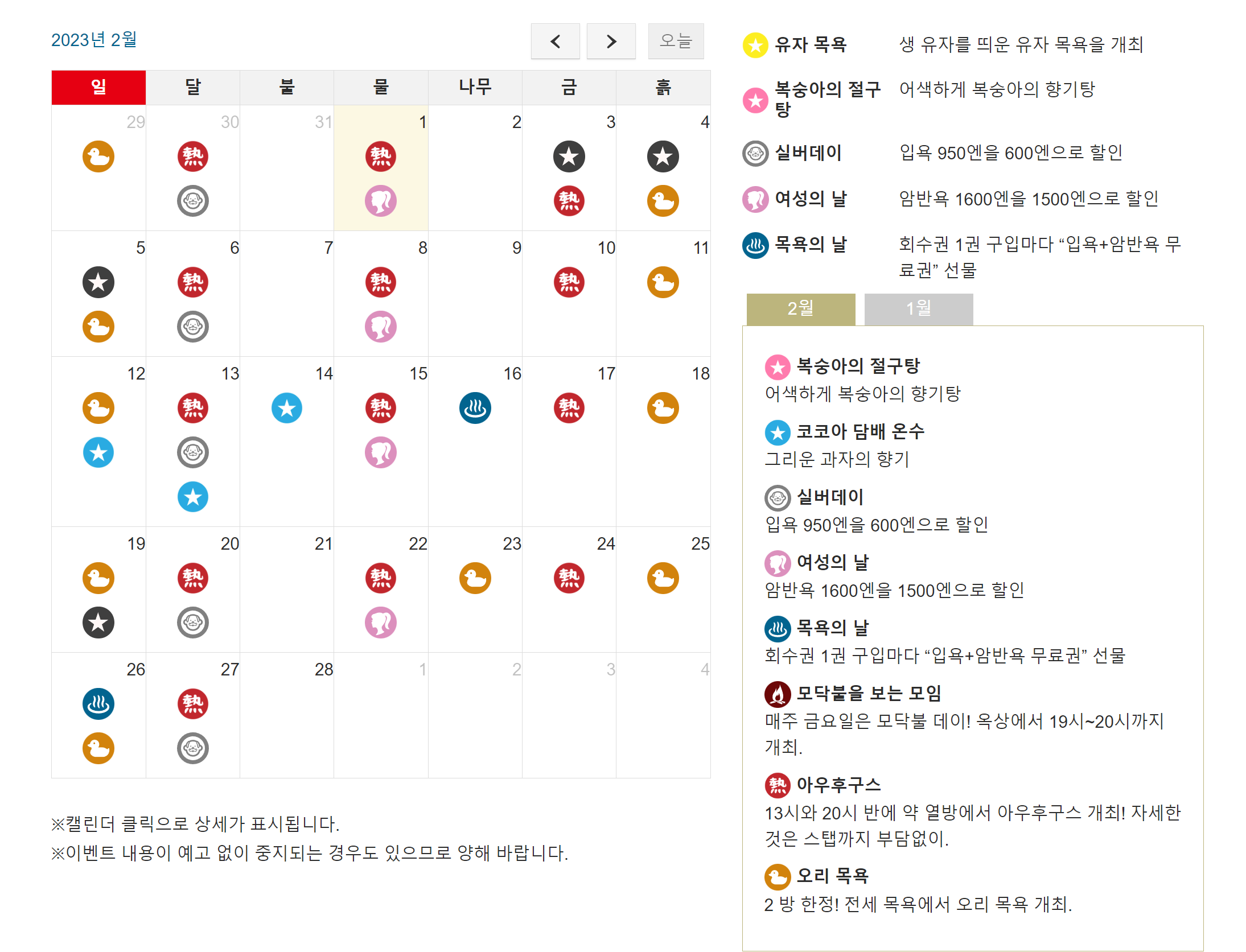 나미하오뉴 온천에선 매일 다른 이벤트가 진행되고 있습니다. 아래에 2월달의 이벤트에 대해 붙여놓겠으니 2월 후쿠오카 여행을 잡으신 분들은 참고하세요!